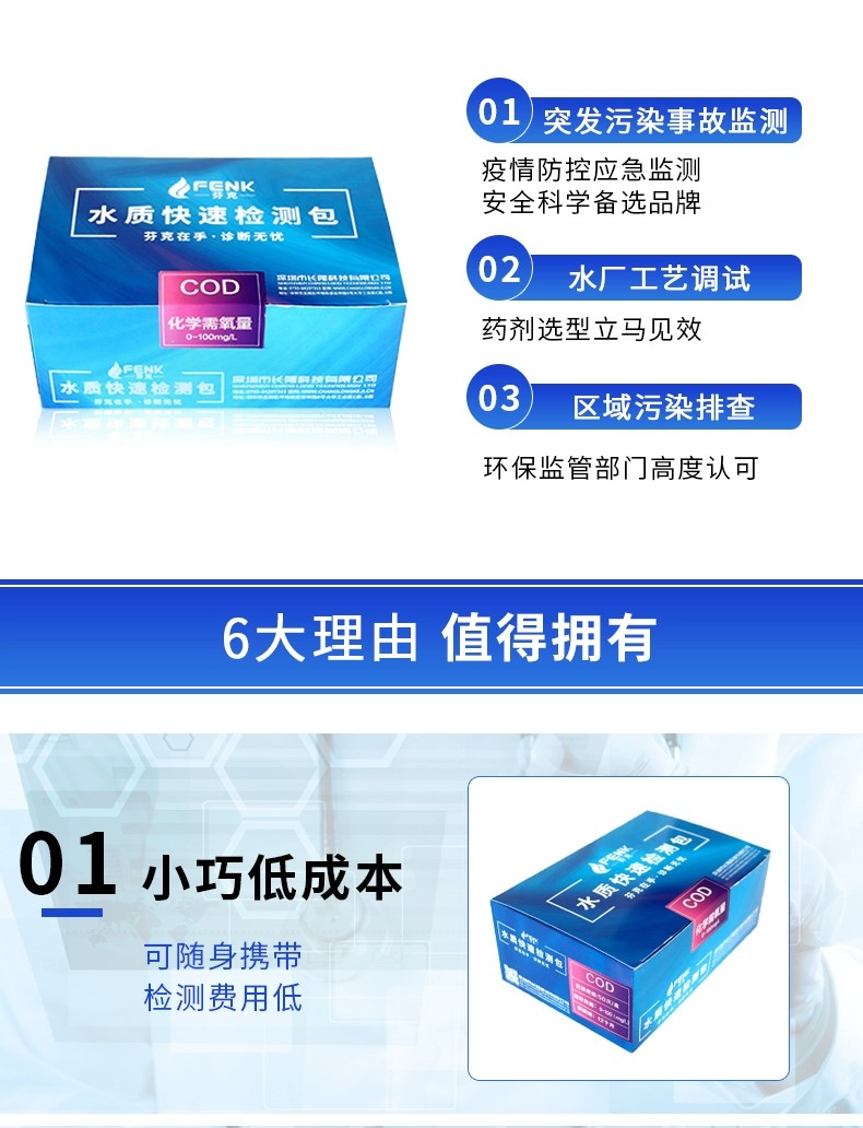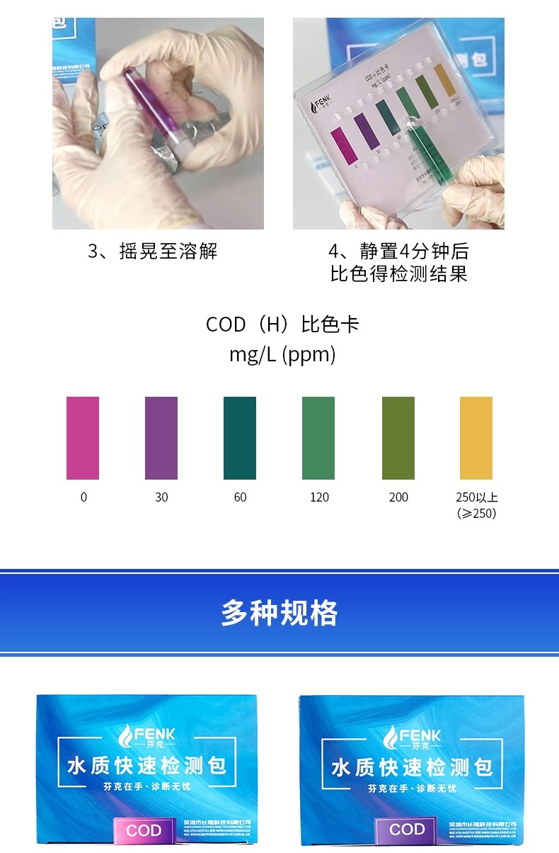 產品簡介:芬克水質快速檢測:批量式樣品檢測,快至1分鐘。準確:依據國標方法開發強抗干擾試劑,申請專利保護。便攜:比色管獨立包裝,可放進口袋。